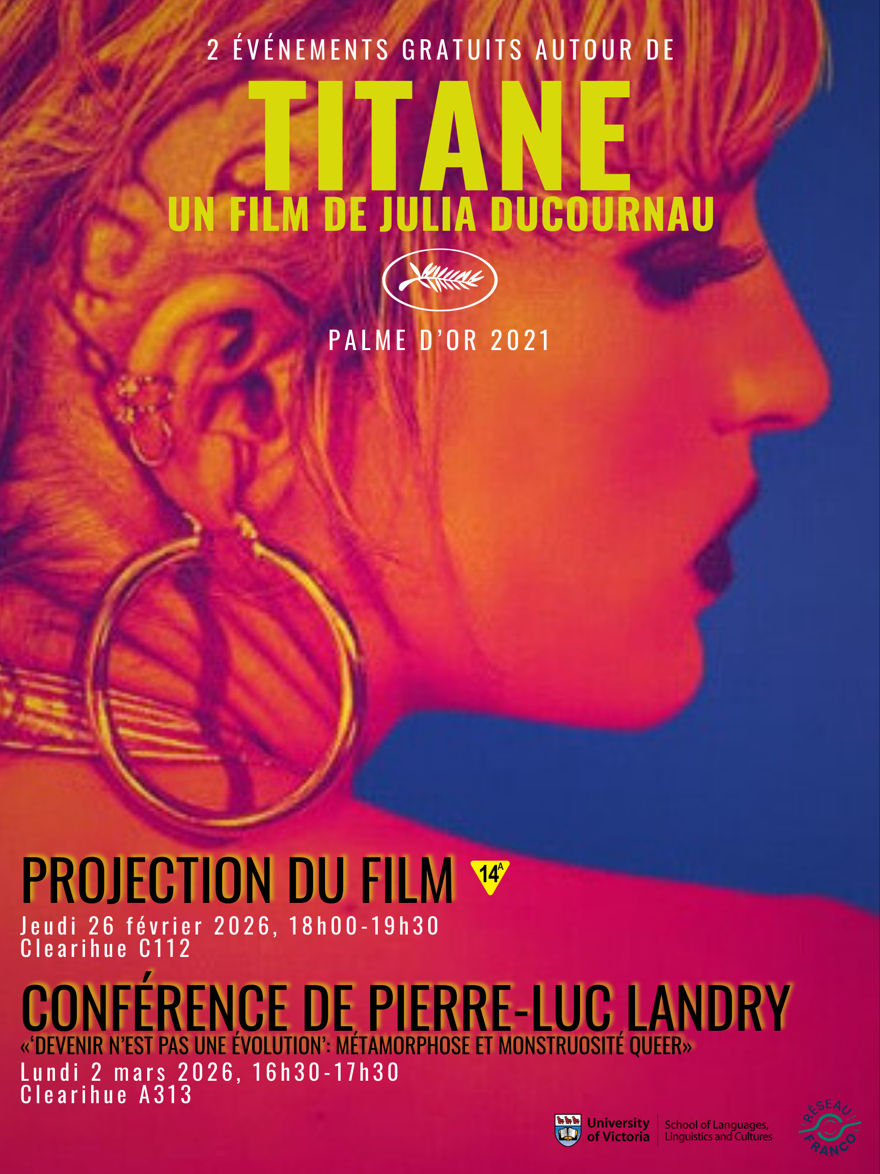 Dans le cadre du Festival Écrans/Scènes organisé par Réseau franco, en partenariat avec le cours FRAN450/506—La Métamorphose offert par le collègue Émile Fromet de Rosnay (School of Languages, Linguistics and Cultures, UVic), je présenterai le film Titane de Julia Ducournau et une conférence sur le devenir, la métamorphose et la monstruosité queer.