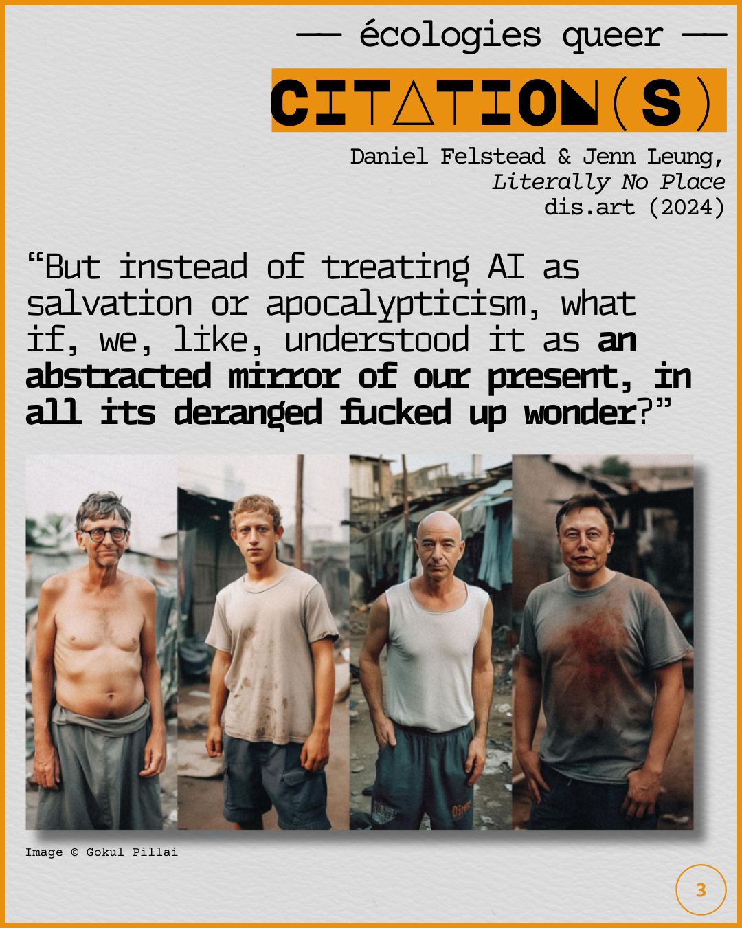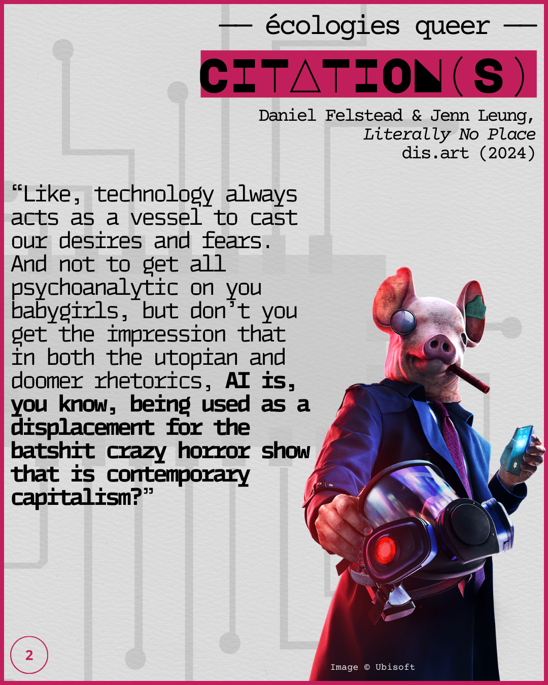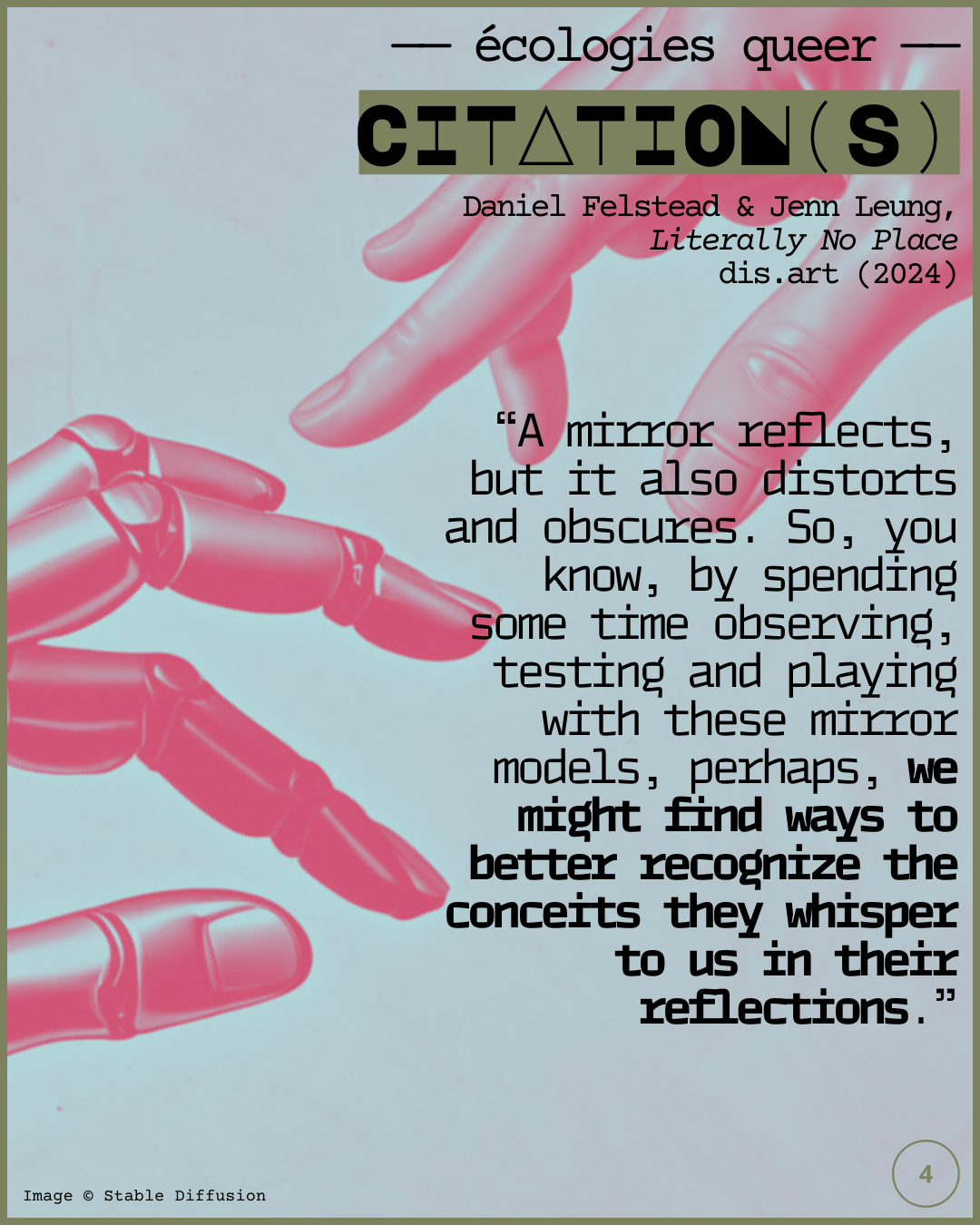 Julia Fox, avatar luisant de Daniel Felstead, s’attaque aux discours utopistes et apocalyptiques concernant l’intelligence artificielle — #ai / #ia — et explore avec humour et acuité certains enjeux du posthumanisme et du transhumanisme importants à la réflexion sur les écologies queer. Un discours critique du capitalisme qui ne mâche pas ses mots.