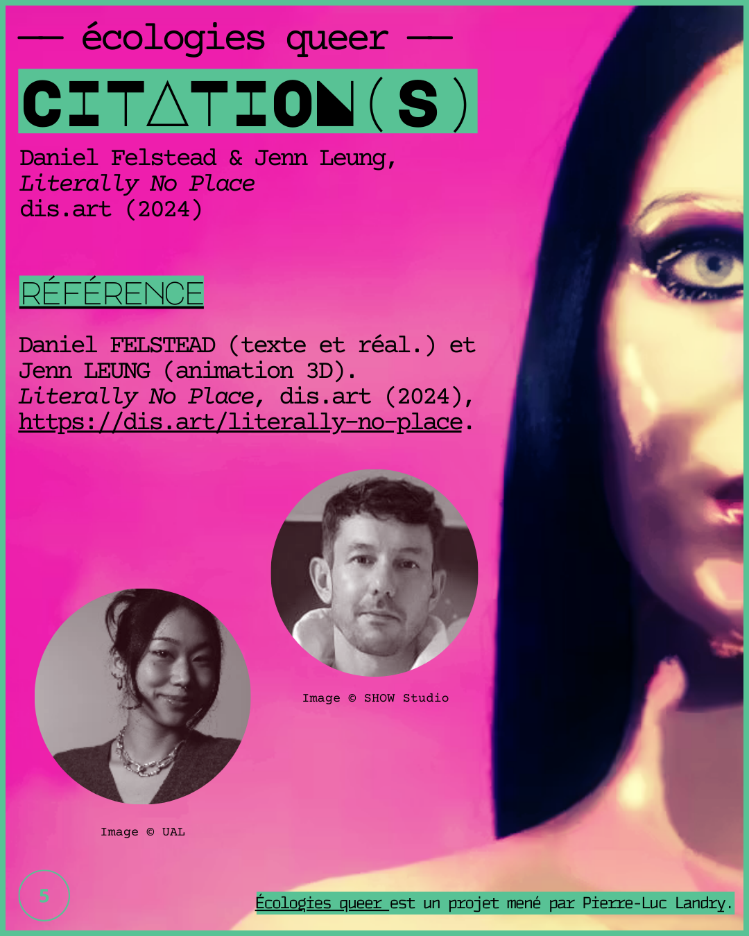 Extrait du film d’art Literally No Place écrit et réalisé par Daniel Felstead, sur une animation 3D de Jenn Leung, et diffusé par Dis.art (2024) — recommandé par Vanina Saracino dans le cadre du cours POSTHUMAN LAB offert au Berlin Art Institute.