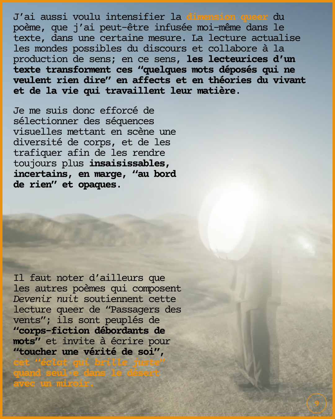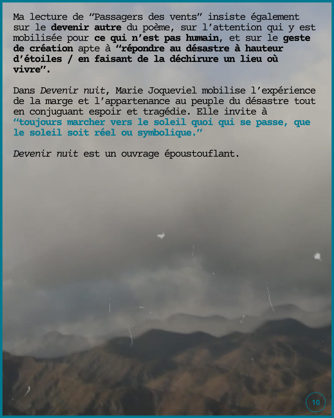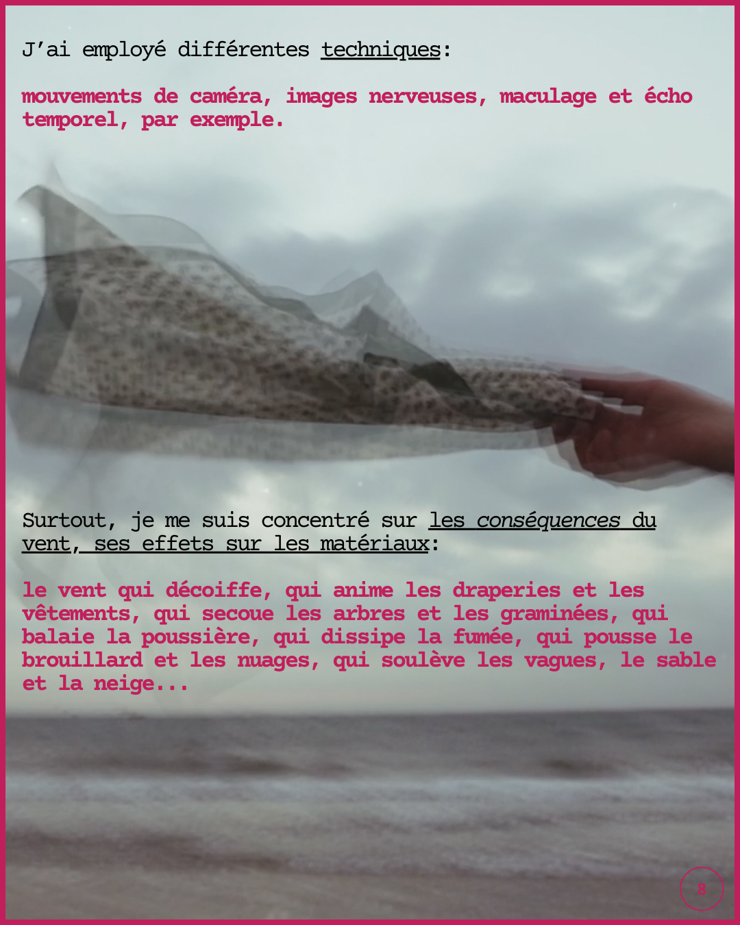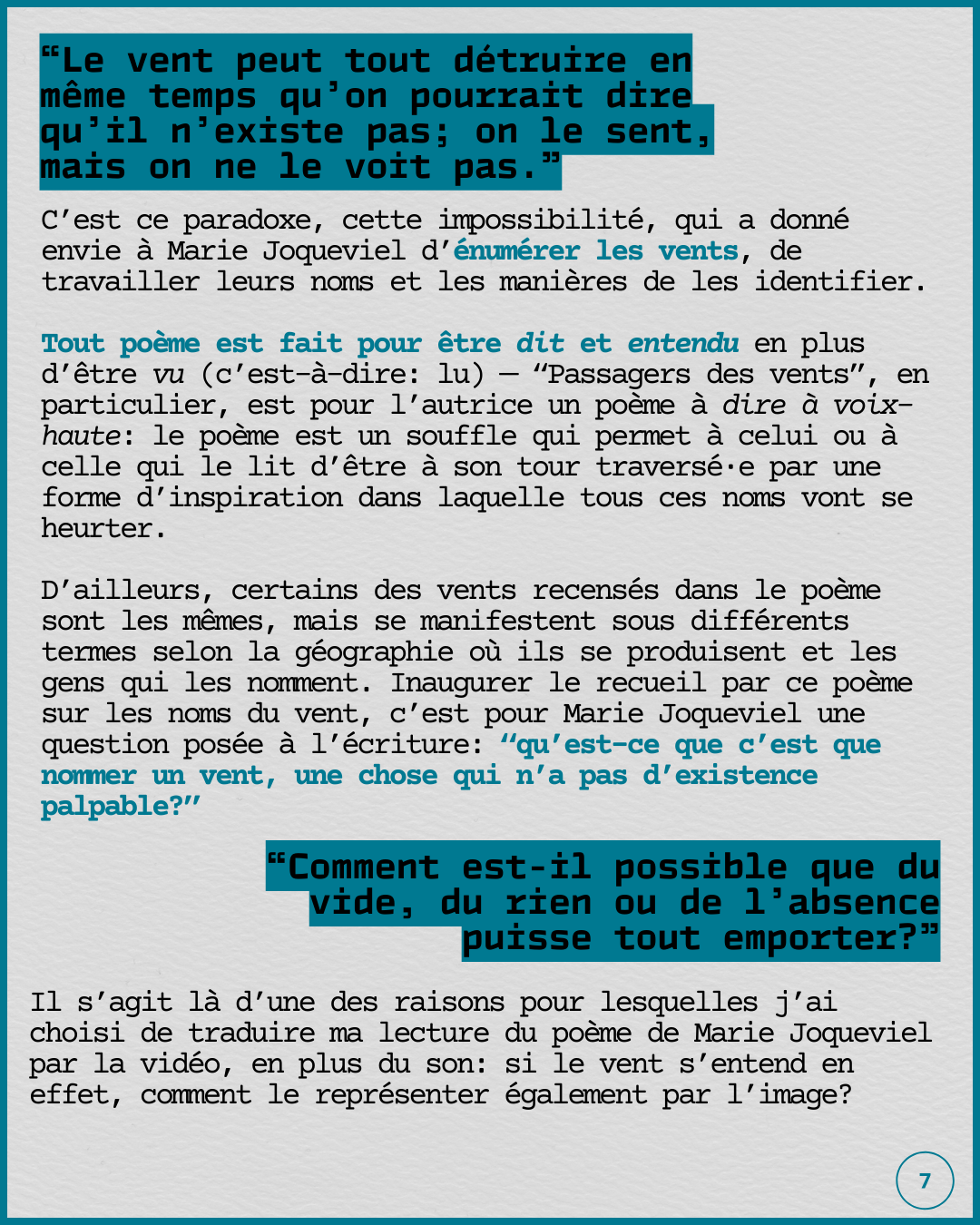 Ce projet explore le monde qui nous traverse, «l’écriture dont est si fort le désir», le devenir vent et le devenir nuit qui se glissent tous deux dans les gestes de création.